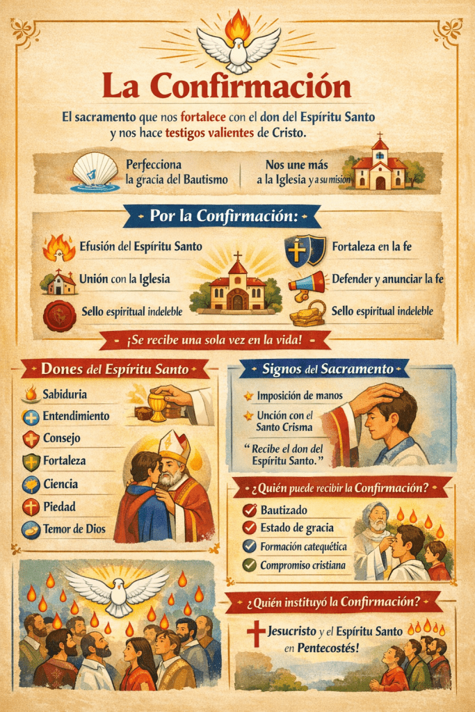 La Confirmación es el sacramento por el cual el bautizado es fortalecido de manera especial con el don del Espíritu Santo, para que pueda vivir su fe con mayor madurez espiritual, firmeza interior y coherencia cristiana, y sea testigo valiente y fiel de Jesucristo en medio del mundo. No se trata solo de un rito o una tradición, sino de una verdadera acción de Dios en el alma, que renueva y robustece la gracia recibida en el Bautismo.